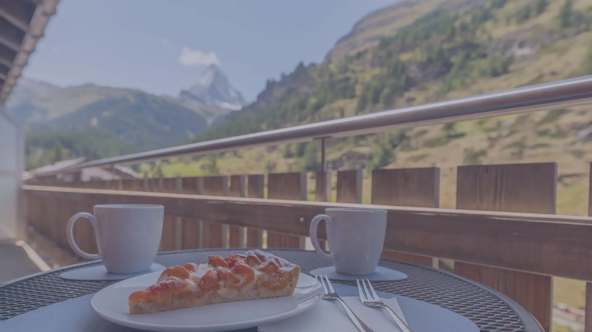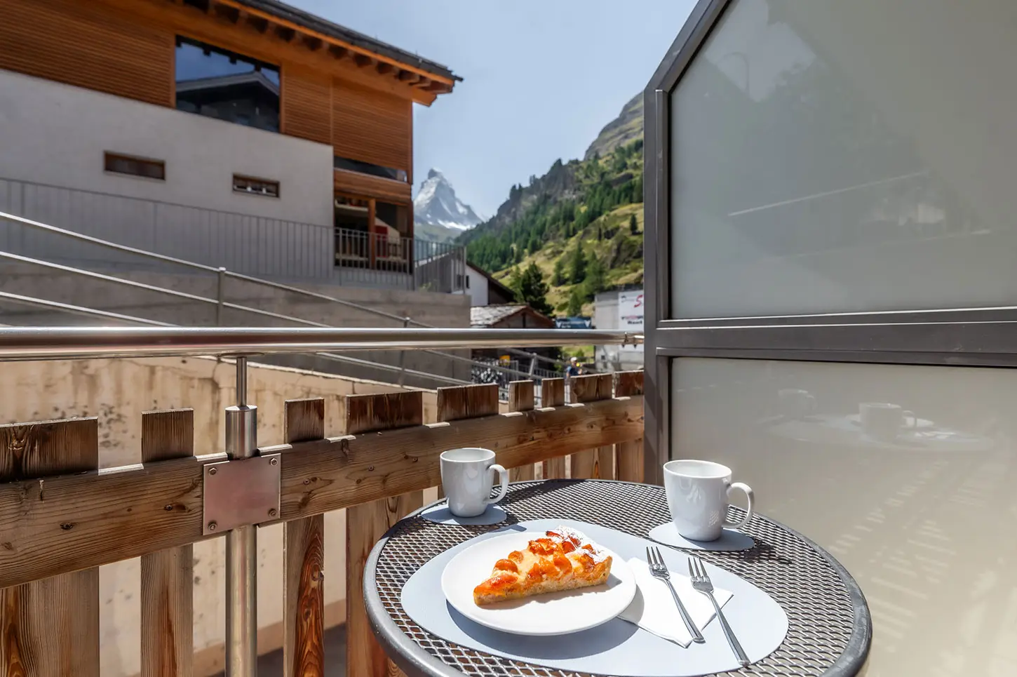 Im Wohnbereich entspannt man sich auf dem Sofa oder den schönen Sesseln. Der Balkon lädt dazu ein, die frische Bergluft zu genießen und die spektakuläre Aussicht auf das Matterhorn zu bewundern.