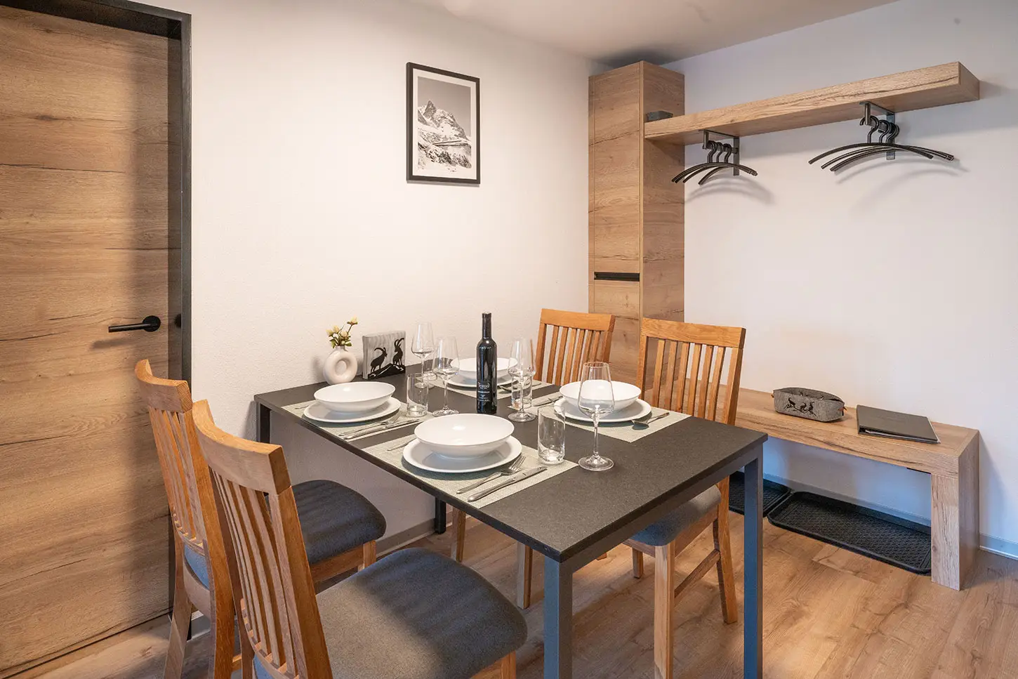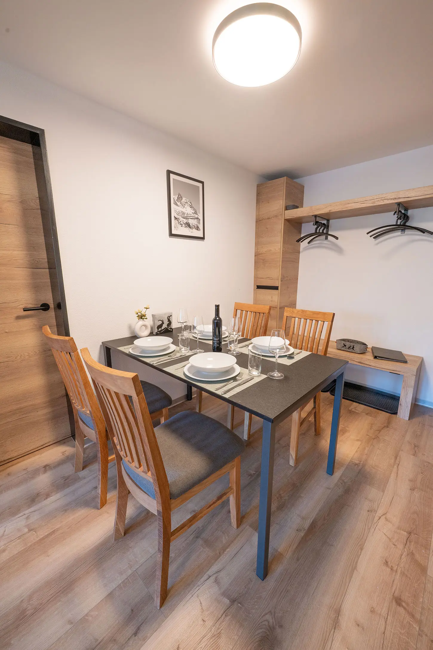Genießen Sie gemeinsame Mahlzeiten am eleganten Esstisch mit schwarzer Granitplatte, perfekt abgestimmt auf die voll ausgestattete Küche mit Spülmaschine, Kühlschrank, Kaffeemaschine, modernem Kochfeld sowie Fondue- und Raclette-Set – für gemütliche Schweizer Abende. Durch die großen Fenster können Sie auch noch während des Essens das Matterhorn bestaunen. Im Wohnzimmer gibt es ein gemütliches Sofa und einen ganz neuen Flat Screen TV für Hight-end Entertainment.