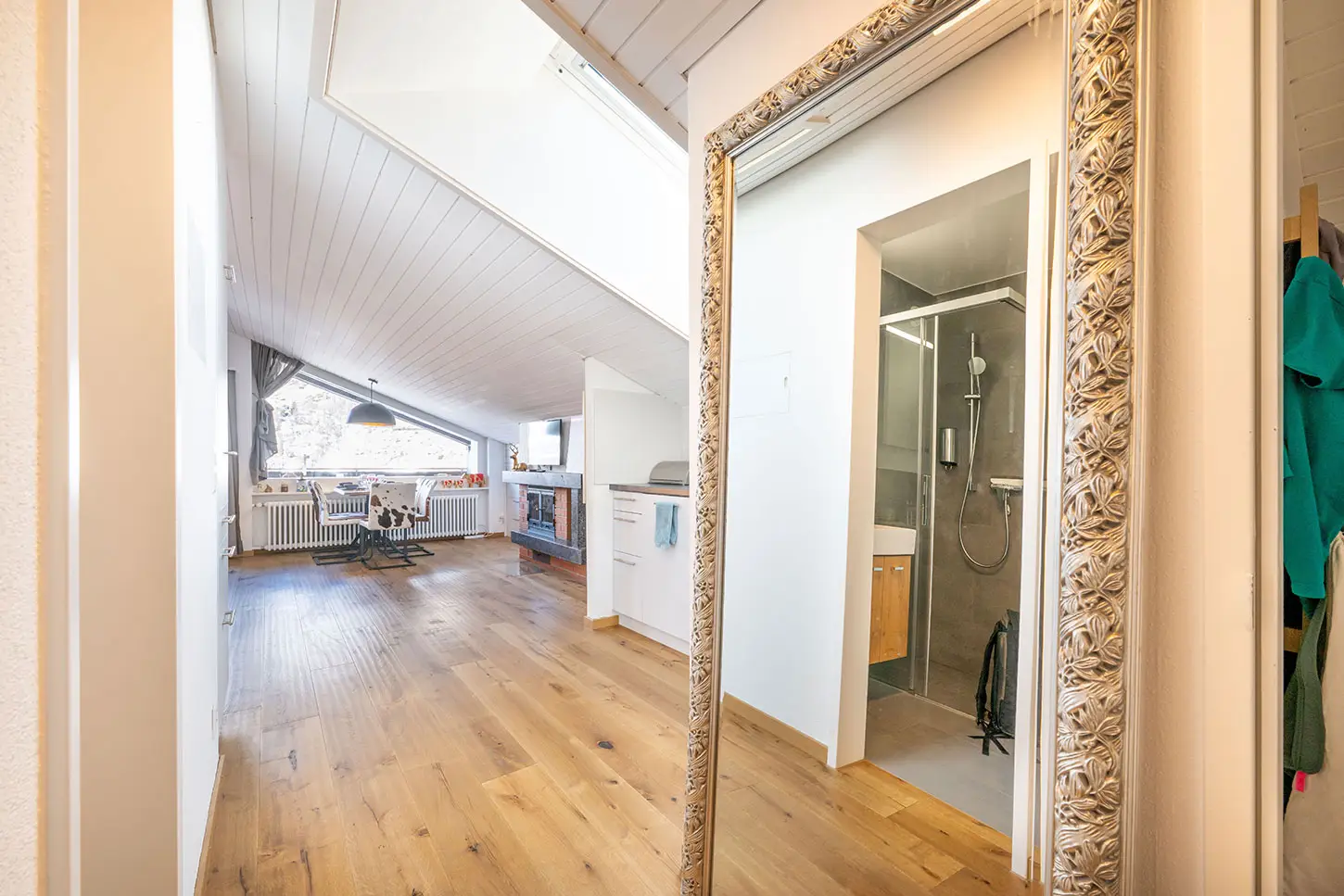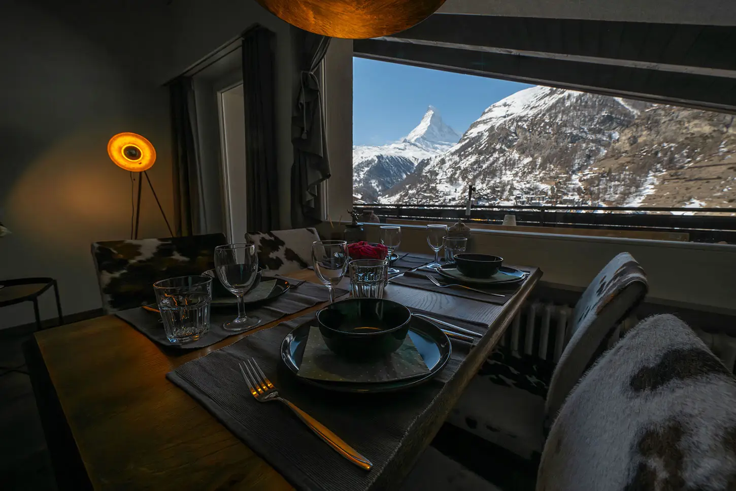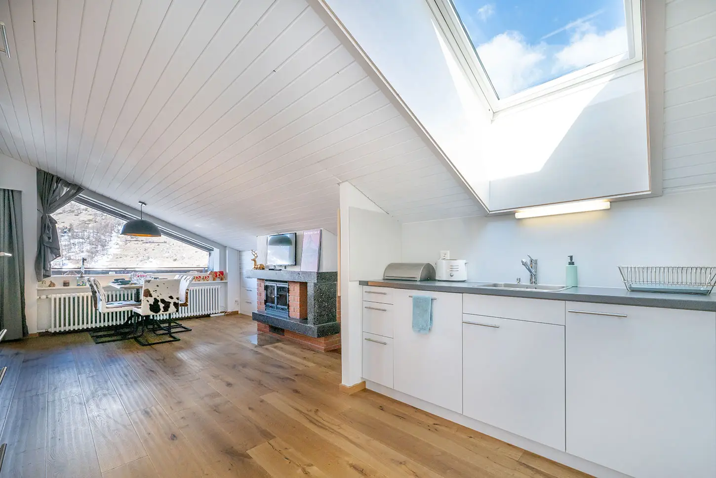 Der großzügige Wohn- und Essbereich besticht durch ein großes Fenster, das Ihnen einen atemberaubenden Blick auf das majestätische Matterhorn bietet. Auf dem Balkon können Sie die frische Bergluft genießen und die spektakuläre Aussicht bewundern.