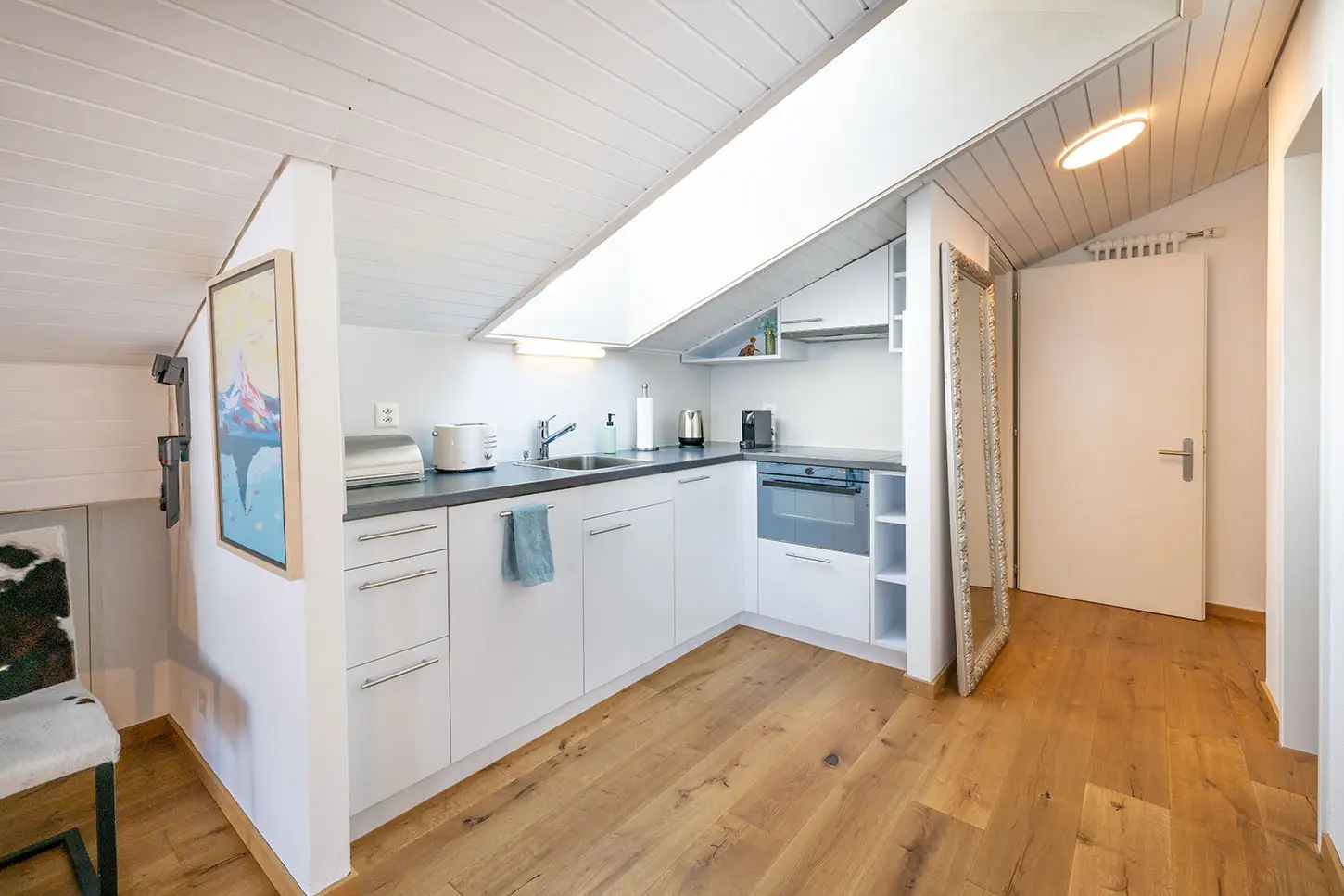 Mit der voll ausgestatteten Küche bleiben keine Wünsche offen – genießen Sie die Annehmlichkeiten eines Backofens, Kühlschranks, eines modernen Kochfeldes, einer Geschirrspülmaschine und einer Nespresso-Kaffeemaschine.
