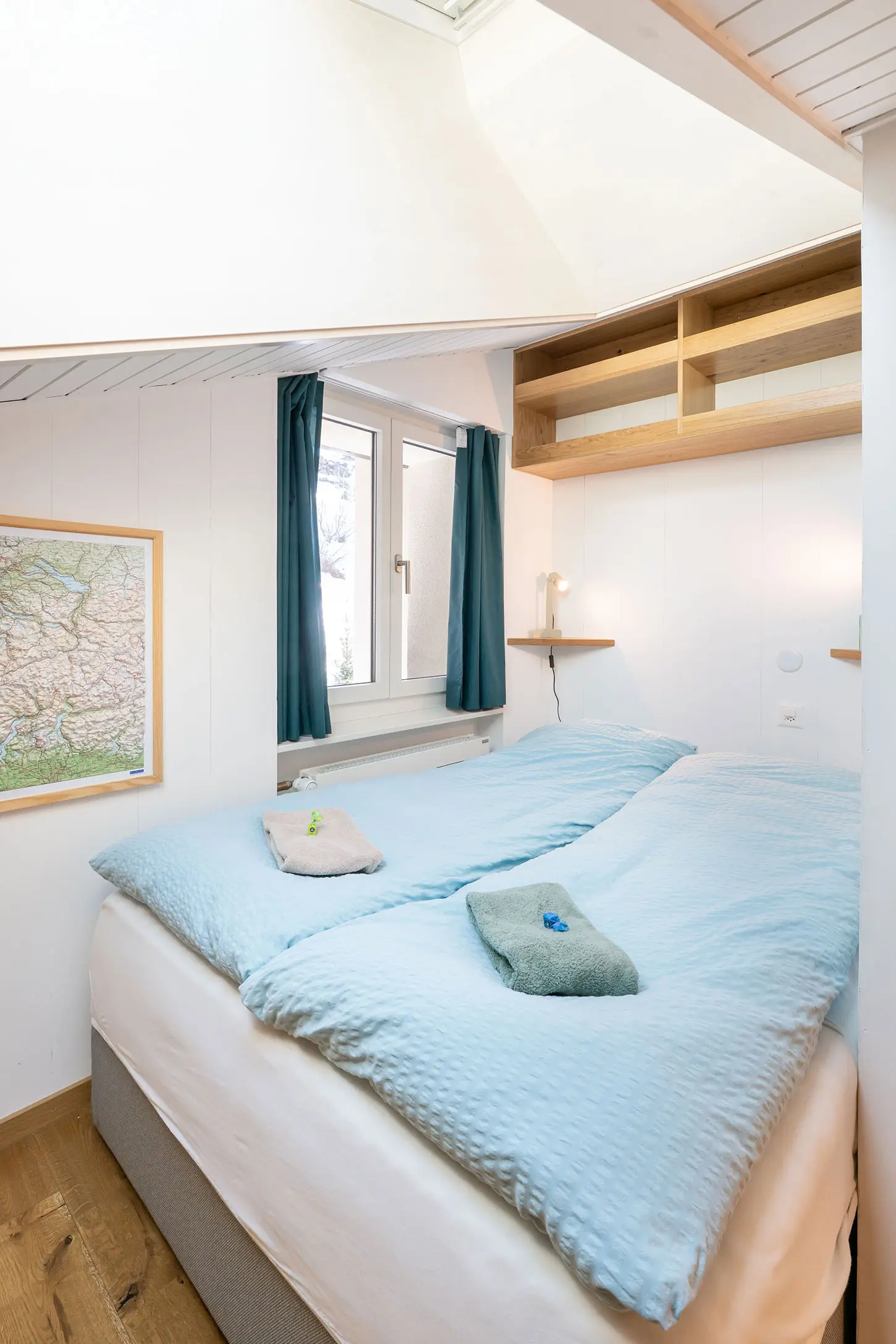 Ein gemütliches Schlafzimmer mit Einbauschränken in warmen Holztönen und einem Doppelbett laden zum Kuscheln ein.