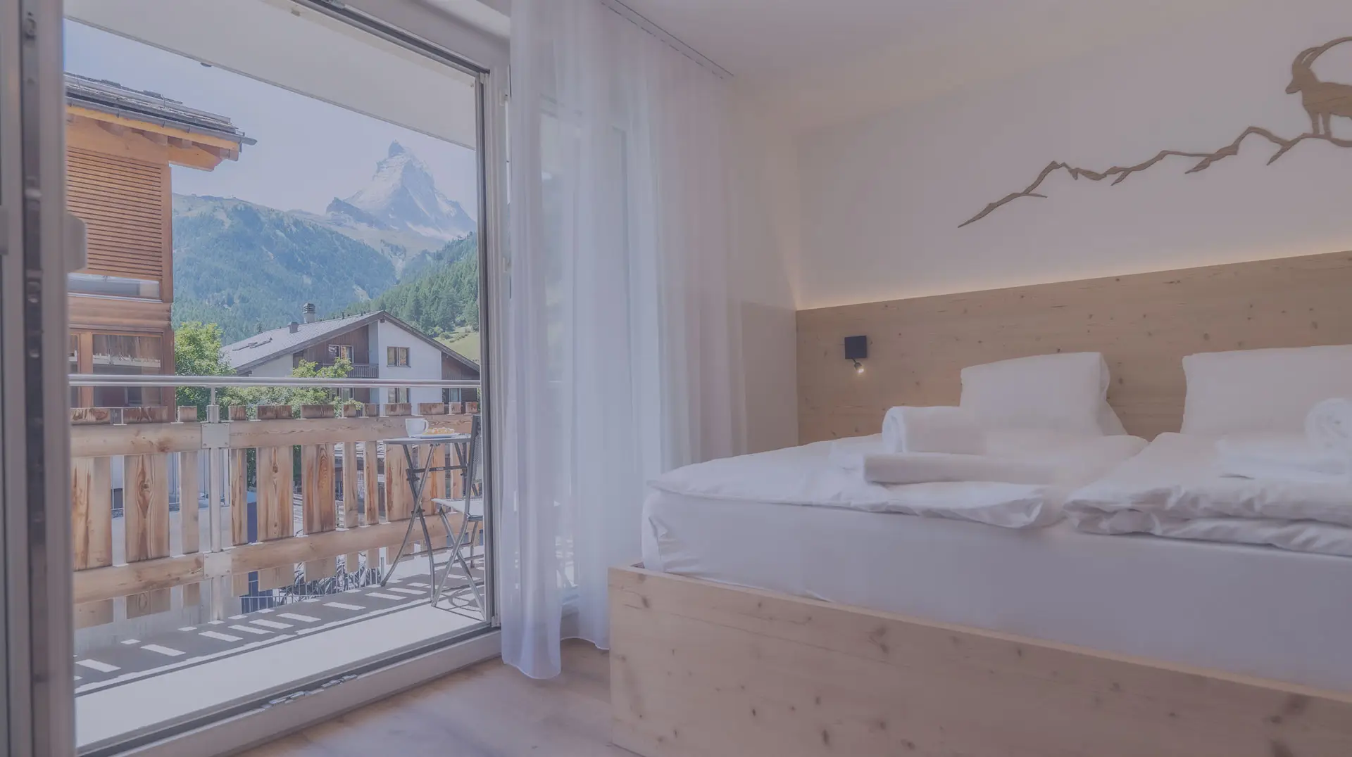 Der großzügige Wohn- und Essbereich besticht durch ein großes Fenster, das Ihnen einen atemberaubenden Blick auf das majestätische Matterhorn bietet. Auf dem Balkon können Sie die frische Bergluft genießen und die spektakuläre Aussicht bewundern.