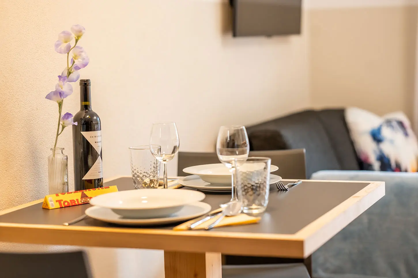 Das Studio ist mit hochwertigen Materialien eingerichtet, die sowohl eleganten Stil als auch Gemütlichkeit ausstrahlen. Jedes Element harmoniert perfekt und schafft eine einladende alpine Atmosphäre zum Entspannen nach einem aktiven Bergtag.