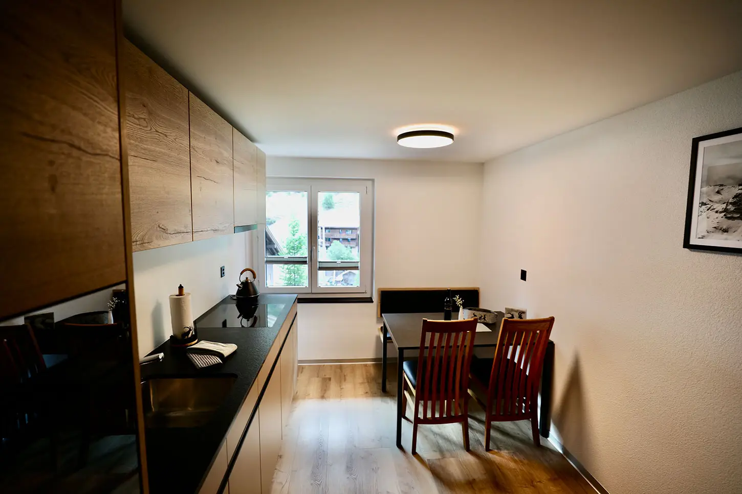 This tastefully furnished studio with a separate bedroom and living room for two people is located on the first floor. A stylish, fully equipped kitchen with all amenities such as an oven, dishwasher, raclette and fondue set invites you to indulge in culinary delights.